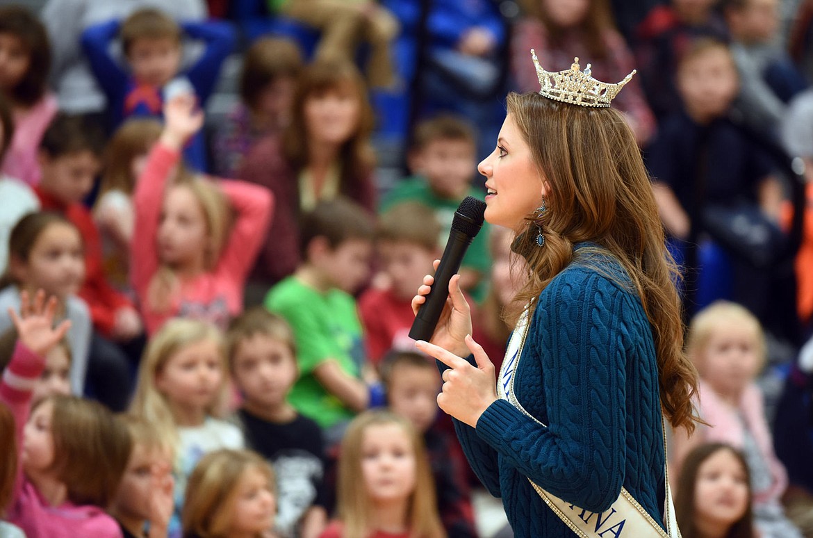 Miss Montana Danielle Wineman of Cut Bank kicks off the 2016 leg of her tour with an assembly at Cayuse Prairie School on Monday, Jan. 18. Wineman and the students recited together the school's anti-bullying pledge: 1. We will not bully others. 2. We will help students who are bullied. 3. We will include students who are left out. 4. If we know that somebody is being bullied, we will report it to an adult at school and an adult at home.