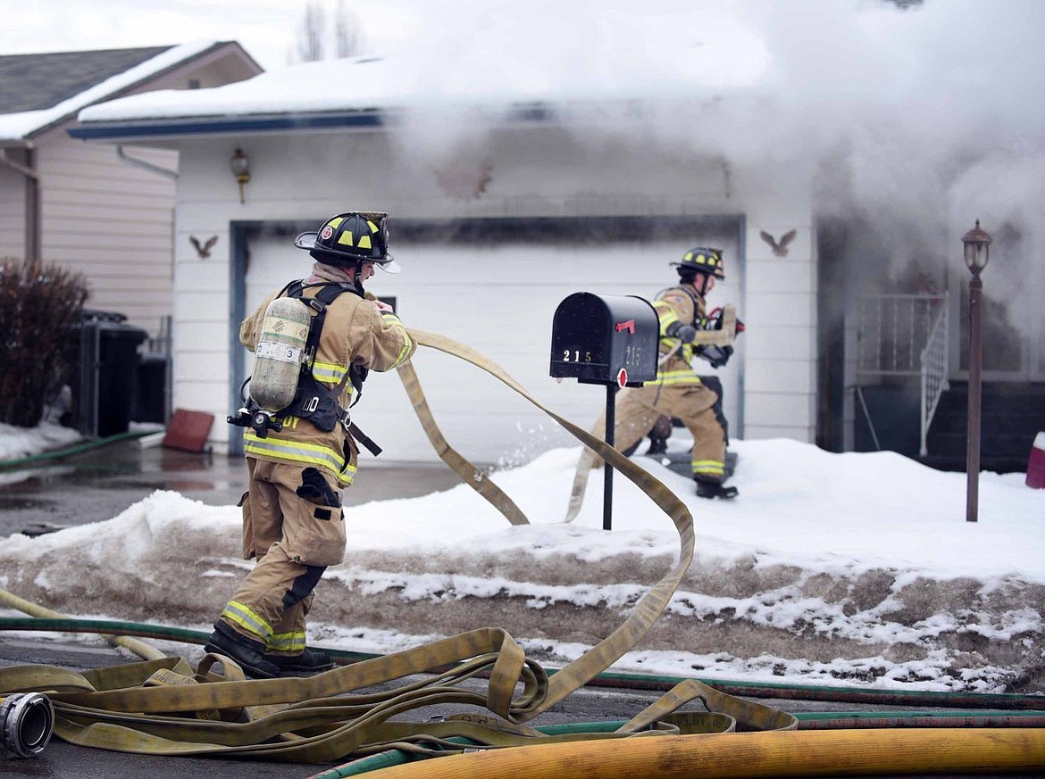 Jeremy Grady, left, and Soren Koetter of the Kalispell Fire Department prepare to enter a burning house at 215 Hawthorne Ave. on Tuesday afternoon. Kalispell Police and Evergreen and West Valley fire departments also responded to the fire. (Brenda Ahearn/Daily Inter Lake)
