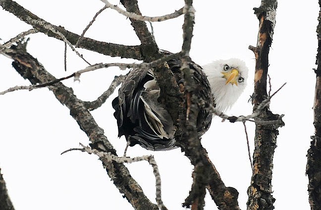 A bald eagle looks down from its perch atop a tree near the Old Steel Bridge on Wednesday. (Aaric Bryan/Daily Inter Lake)