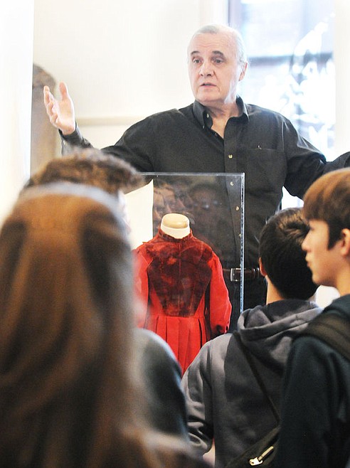 The Museum at Central School Director Gil Jordan speaks to a group of Bigfork eighth-graders about his favorite artifact at the museum, a red dress worn by Margaret Duffy on Christmas Eve in 1891. (Aaric Bryan/Daily Inter Lake)