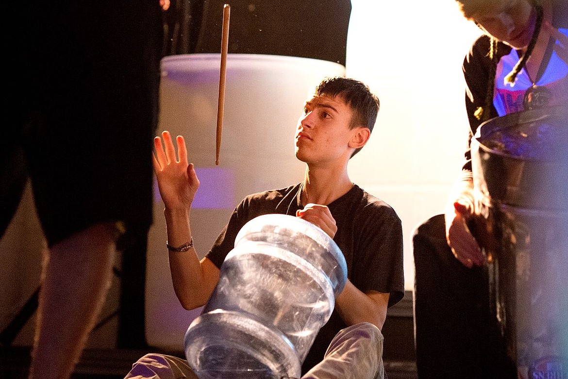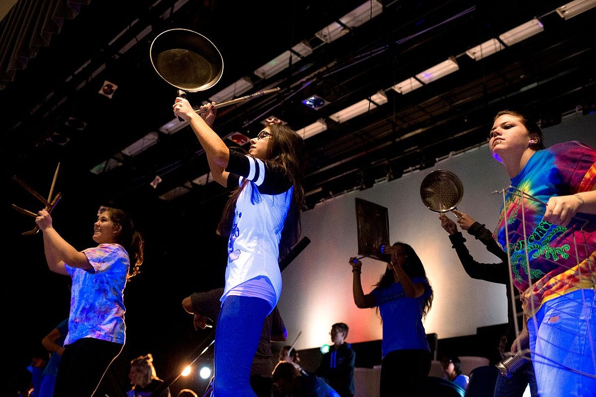 Instead, all the students in the auditorium had random objects to use for their percussion instruments — pots, pans, barrels, buckets, pipes and more.