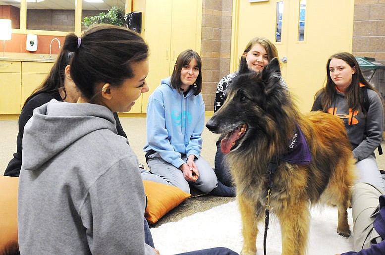 A group of Glacier students sits with Belgian shepherd Brenner during lunch after a finals session on Thursday. (Aaric Bryan/Daily Inter Lake)