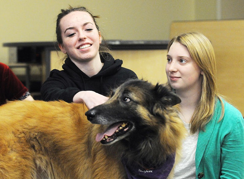 Glacier High School sophomores Abri Turner, left, and Taylor Fraemer pet the Belgian shepherd Stryker during lunch at the school on Thursday. The dogs were at the school to help the students relieve stress during finals. (Aaric Bryan/Daily Inter Lake)