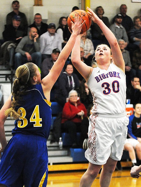 Bigfork's Lana Berg shoots over Libby's Shannon Reny during the Valkyrie's 57-36 victory at home on Friday. (Aaric Bryan/Daily Inter Lake)