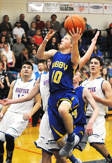 Libby's Jonny Cielak goes up for a shot in a crowd of Bigfork defenders during the first quarter in Bigfork on Friday. (Aaric Bryan/Daily Inter Lake)
