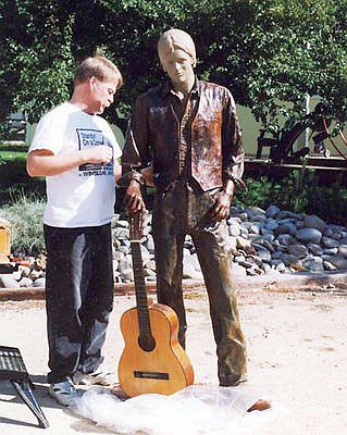 He flew to Arizona with a one-third scale clay model of his proposed sculpture, a two-feet tall man playing a guitar, to pitch his work to the group. During his meeting with the committee, he found out they intended to place the sculpture on a corner, at street level.