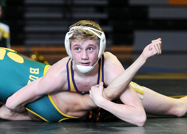 Polson's Bridger Wentzel pins Whitefish's Eli Taylor at the 41 second mark to help the Pirates beat the Bulldogs 62-12 in a dual at Whitefish on Thursday. (Aaric Bryan/Daily Inter Lake)