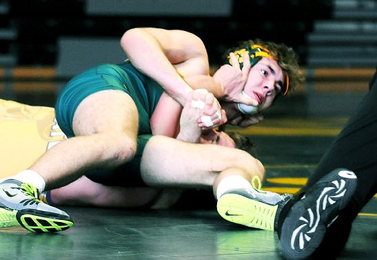 Whitefish's Konrad Zinke looks up at the ref as he pins Polson's Noah Humphrey right as the first period ends in the 182-pound bout. (Aaric Bryan/Daily Inter Lake)