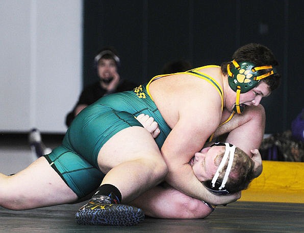 Whitefish's Steven Quimby pins Polson's Nick Marquart at the 1:31 mark to win the heavyweight bout during a dual at Whitefish on Thursday. (Aaric Bryan/Daily Inter Lake)