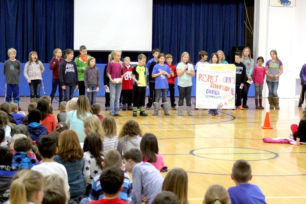 Thompson Falls fourth graders present an oath with their fellow students to uphold the five pillars of the school during an Oweus assembly last week. The class also read a poem they had written about not being a bully.