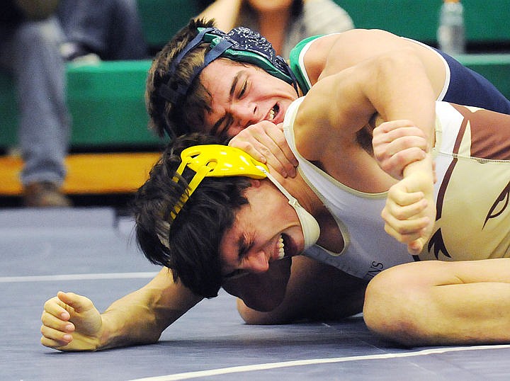 Glacier's Tyler Eierdam holds Helena Capital's AJ McBroom to the ground during the 138-pound match at Glacier on Saturday. (Aaric Bryan/Daily Inter Lake)