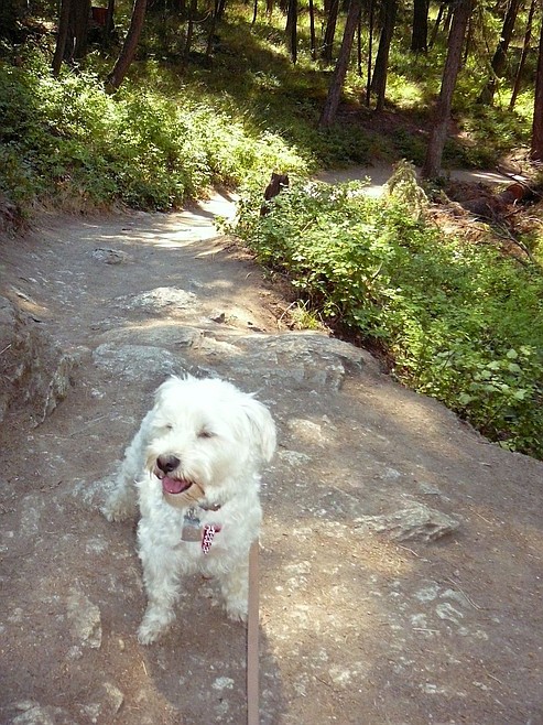 A quick walk through the park warmed up our legs, and at the start of the trail near the Harbor House and the Third Street marina, we got down to the business of hiking. The first part of the hike is fairly steep, with plenty of jagged rocks to trip you up. The nimble Journey bounded easily upward, and luckily the trail leveled out soon and we could both ease off the gas.