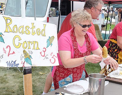 Shirley Johnson of Alexandria, Minnesota serves up corn on the cob Saturday during Troy's Old Fashioned Fourth of July. (Paul Sievers/The Western News)