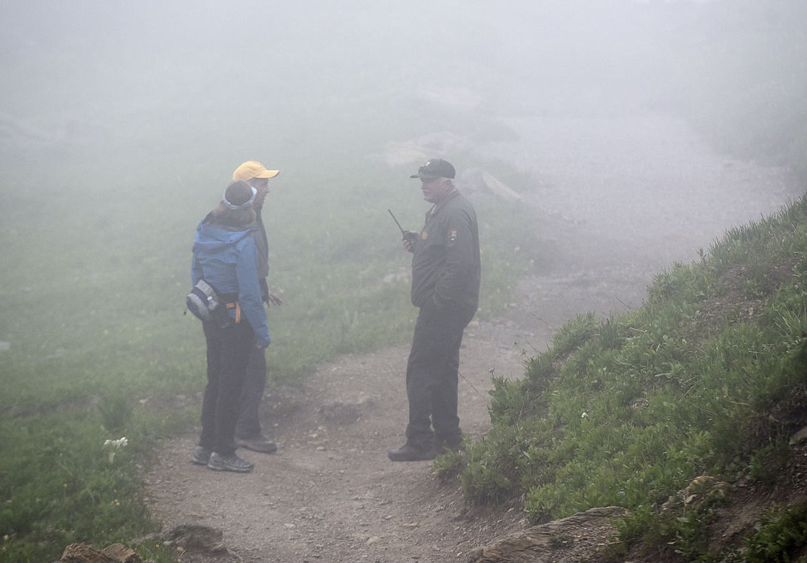 Two of the first visitors to hike Glacier National Park’s popular Highline Trail this year took in some unexpected scenery Wednesday morning when a grizzly sow and her cub materialized from the alpine fog blanketing the area.