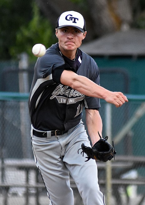 Glacier Twins pitcher A.J. Wetsch attempts to throw out a Spokane Cannons baserunner Friday, July 8, 2016 at Memorial Park in Whitefish. (Matt Baldwin/Whitefish Pilot)