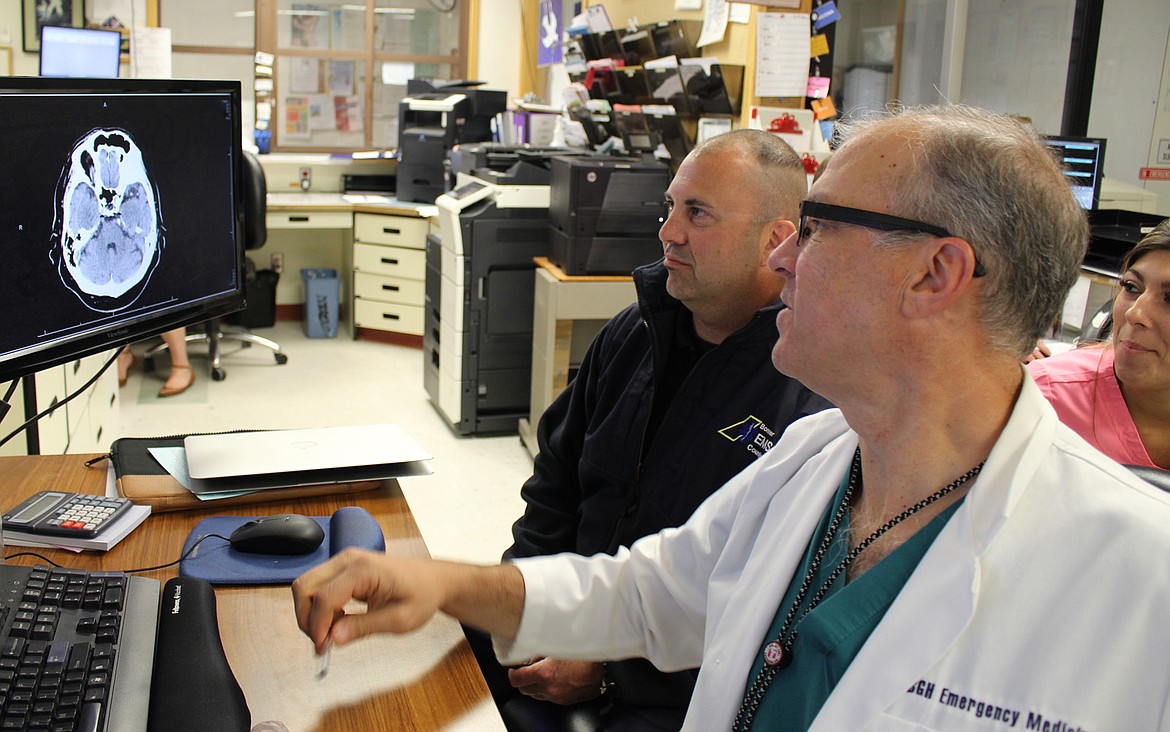 While in the ED, the paramedics have been observing assessments, helping with patient care, and assisting with advanced procedures. Normally, the paramedics are assigned to either an ambulance or quick-response sport utility vehicle and their patient care stops when care is transferred to the BGH ED staff. In this setting, the medics learn more advanced assessment practices, get a chance to review and practice seldom-used skills, and collaborate with ED physicians on patient diagnoses and long-term treatment plans.