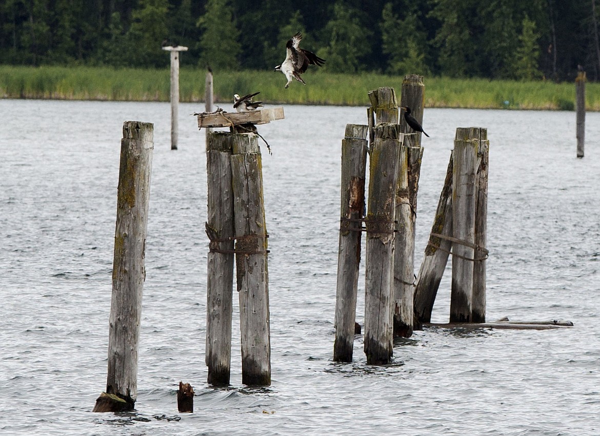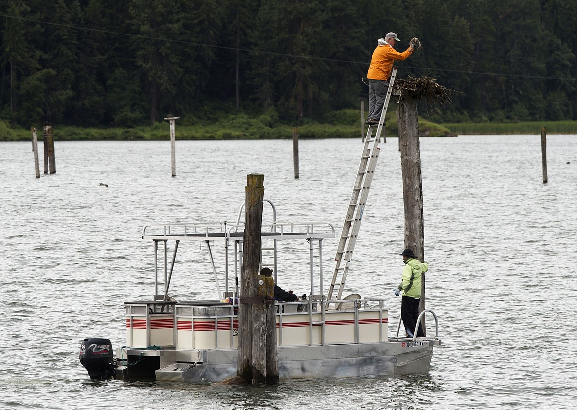 As wildlife biologist Wayne Melquist and his crew pulled their boat up to a piling in Cougar Bay on Saturday morning, an adult osprey flew from the nest situated high atop the piling.