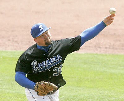 Brandon Laffoon pitching top of fourth inning first of a doubleheader vs. Strathmore Reds Saturday. Alumni game 2016.