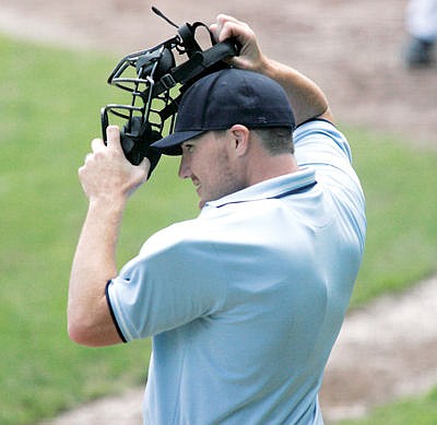 Loggers Manager Kelly Morford as umpire during Saturday's inaugural Border War alumni doubleheader. (Paul Sievers/The Western News)