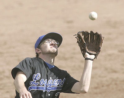 Third baseman Will Reichel with the third out top of sixth inning vs. Strathmore Reds Saturday. Second of a double header. Inaugural Border War alumni game. (Paul Sievers/The Western News)