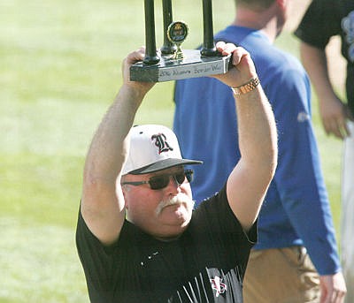Strathmore Reds alumni coach Darwin Armitage displays the 2016 alumni border war trophy after the Reds swept the Logger Legends in Saturday's doubleheader alumni game.