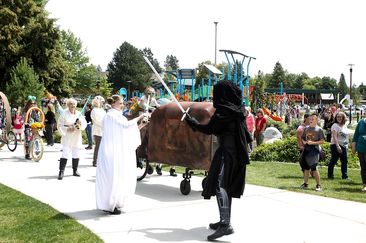 Two of the biggest entries this year were also two of the biggest hits with the crowd. One was a Star Wars-themed vehicle, built by the Roberts family who was in the process of moving to Coeur d'Alene from Utah when they recently discovered the Coeur d'Alene maker space, Gizmo, on Fourth Street. The group consisted of Heather and Marty Roberts, with Heather dressed as a Jedi and Marty dressed as Kylo Ren. Their daughter Loren, 13, was dressed as Princess Leia, and even grandma joined in as a Jedi. But the main character was 10-year-old Lila, who dressed as Rey who was introduced in the movie "The Force Awakens," which is what they dubbed their entry. Heather said they "really love" Star Wars and Lila connects with Rey's character.