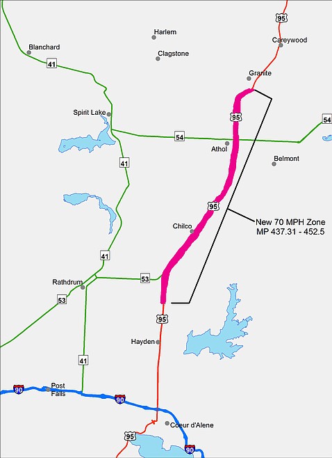 COEUR d'ALENE — A 15-mile stretch of U.S. 95 from north of Hayden to north of Athol will increase from 65 mph to 70 mph on Monday.