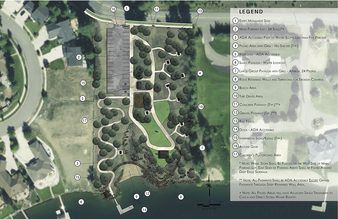 The plan also includes two pavilions — one overlooking the river — a retaining wall to prevent erosion, pathways, parking, restrooms and access gate.