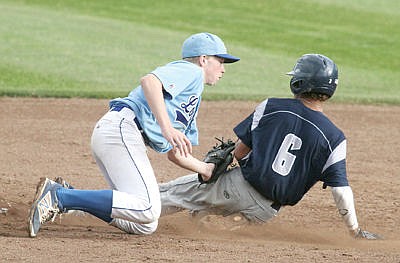 Second baseman Seth Bateman put the tag on Beau King for the first out top of seventh inning Saturday evening. First of a double-header vs. the Missoula Mavericks. (Paul Sievers/The Western News)