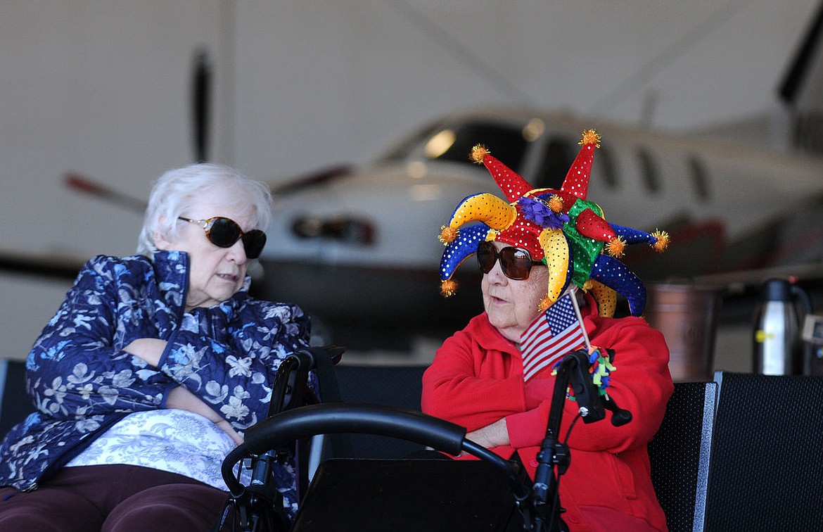 Eighty-five year old Phyllis Bouton, right, waits with her best friend Naomi Sherper for her turn to take a flight in a plane during the Dream Flights event at the Glacier Jet Center on Monday. (Aaric Bryan/Daily Inter Lake)