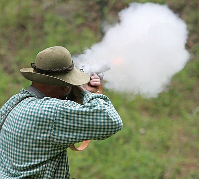 Mike "Lone Oak" Tomell fires his custom made Grady Kerr .62 cal. flintlock rifle Saturday during Rendezvous 2016 at Fawn Creek Campground. (Paul Sievers/The Western News)