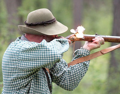 Mike "Lone Oak" Tomell fires his custom made Grady Kerr .62 cal. flintlock rifle Saturday during Rendezvous 2016 at Fawn Creek Campground. (Paul Sievers/The Western News)
