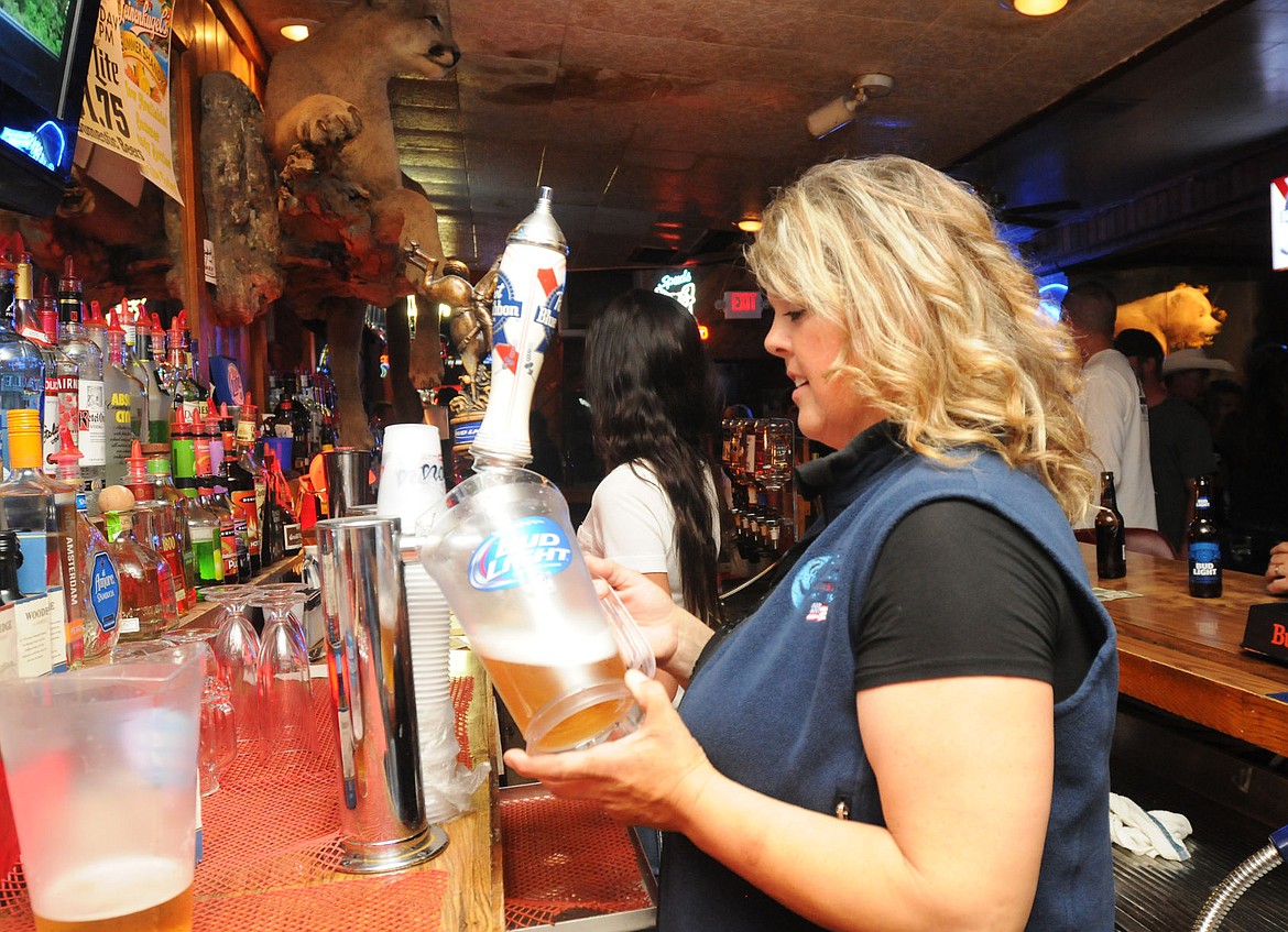 Charlene Sapa fills a pitcher of beer at the Blue Moon on Saturday.