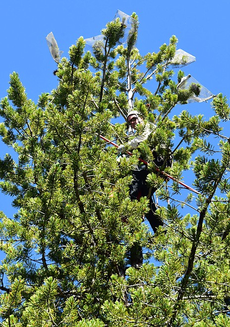 Hal Herring cages the cones of a whitebark pine tree on Big Mountain Tuesday, July 18. The cages protect the tree from disease.