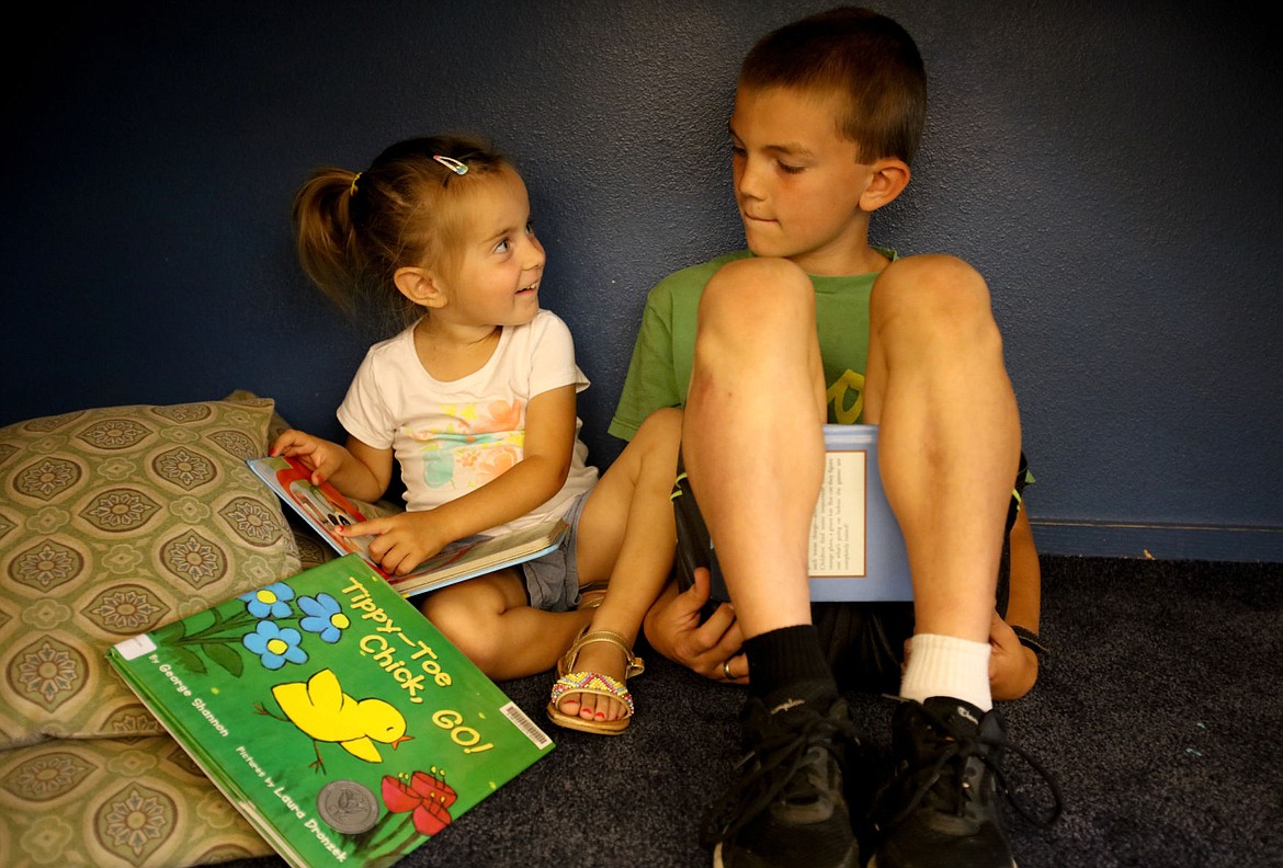 Tanner's little sister, 3-year-old Alexis, proudly held up her two books that included "Tippy-Toe Chick, Go!" and "Noodle Loves to Drive." Although Alexis can't read the books herself, their mother, Michele, said Alexis likes to point out the letters she knows. She also enjoys looking for Goldbug in the Richard Scarry books, Michele said.