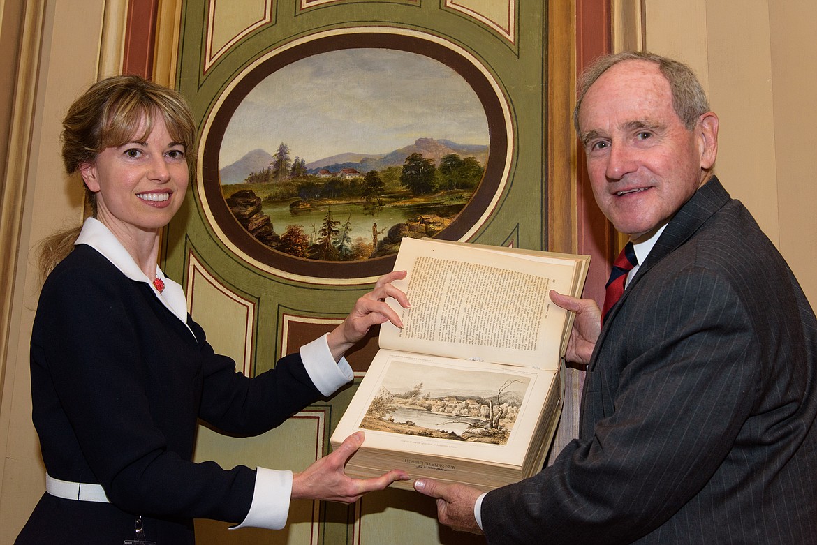 The discovery originally occurred in 2013 when assistant Capitol Curator Amy Burton was poring through thousands of books and documents while conducting research to write her own book about restorative work in the Capitol. She was investigating where Brumidi got his inspiration when she happened upon old drawings and paintings from railroad expeditions to the West. The original watercolor was painted by John Mix Stanley around 1854, turned into a lithograph, published in the Pacific Rail-road Report Volume 12 and chosen by Brumidi as a scene to include in a series of eight wildlife oval "medallions" he painted in the Capitol.