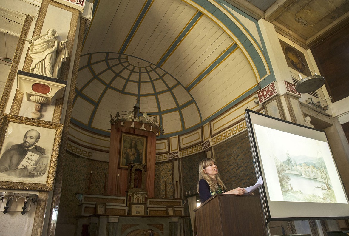 Assistant Capitol Curator Amy Burton gave a detailed and enthusiastic presentation about how she linked a fresco in the U.S. Capitol Building to a watercolor painting John Mix Stanley created while on a railroad expedition through North Idaho in the 1850s.