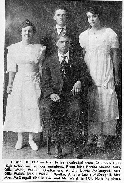 A hundred years ago, four students formed the first graduating class of Columbia Falls High School. William Opalka, Bertha Shouse Jolly, Amelia Lewtz McDougall and Ollie Walsh graduated in 1916.
