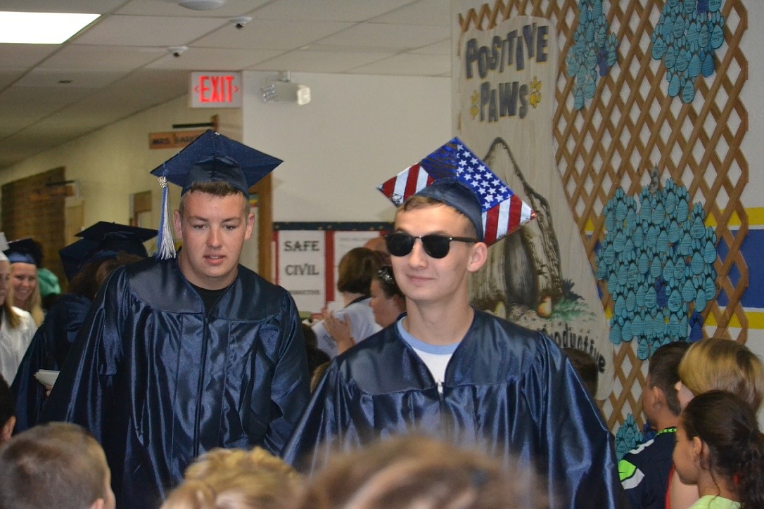 2016 Seniors greeting the 400 student at Valley View in their Cap and Gowns.