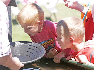 Barrett Moe, left, and Bridger Moe learn the art of panning for gold Saturday during opening day at the Heritage Museum.