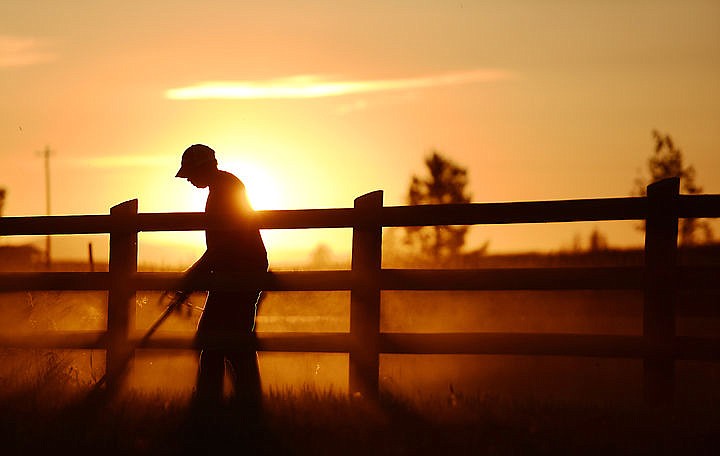 Ryan How attempts to beat the heat by working on his yard late in the evening on Friday, June 4, at his home near Lake Blaine. (Brenda Ahearn/Daily Inter Lake)