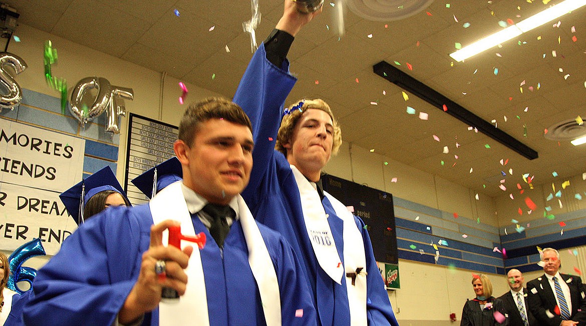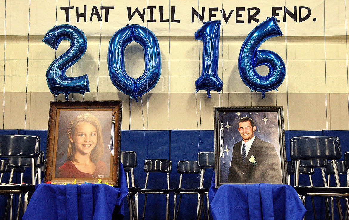 But every one of them wore a brown ribbon with a piece of rope in memory of two fallen classmates, Shelby Roden and Cody DeTrolio, who didn’t make it to this day. Roden passed in 2010 when they were in the sixth grade and DeTrolio was involved in a fatal car accident just last year. The class opted to have portraits of their friends on two empty chairs in the center of the stage.