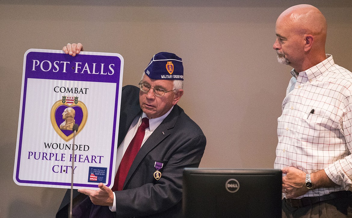 Commander for the Military Order of the Purple Heart, Ned Baker, and local Purple Heart recipient and active promoter of veteran support, Len Crosby, gave the city a sign to prove it is a Purple Heart City. A designated Purple Heart recipient parking space has already been installed at Post Falls City Hall.