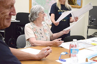 Ray Eanes, center, reads a ballot in which someone wrote in Ronald Reagan for president of the United States as Dean Walston, left and Maryln Walston, right, look through over-vote ballots. Another voter wrote Mickey Mouse in for the presidential nomination. (Seaborn Larson/The Western News)