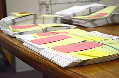 Absentee ballots await processing as the election night crew dove through the ballots from Tuesday's primary election. (Seaborn Larson/The Western News)