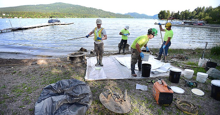 The crew from SuperTec begins to add a fiberglass lining to a manhole along the shore of Whitefish Lake on Wednesday morning, June 8. In this round of work be lining 44 manholes. (Brenda Ahearn/Daily Inter Lake)