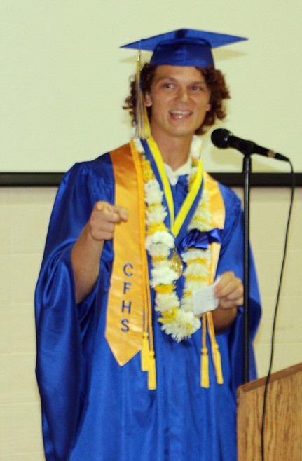 He presented National Honor Society chords to three of the students, and then introduced the first speaker, co-valedictorian Derek Lowry. CFHS had two valedictorians this year because there was on about 1/1,000th of a difference in the top students' GPAs, Kemink said. Co-valedictorian Niko Icardo followed Lowry with a speech of his own.