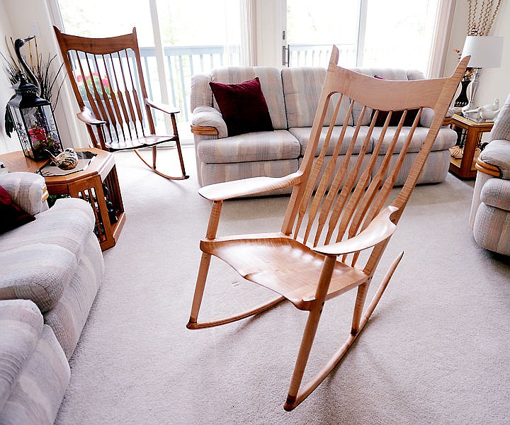 Two of the completed rocking chairs by Hans Mizee in his home on Monday, June 13, west of Kalispell. (Brenda Ahearn/Daily Inter Lake)
