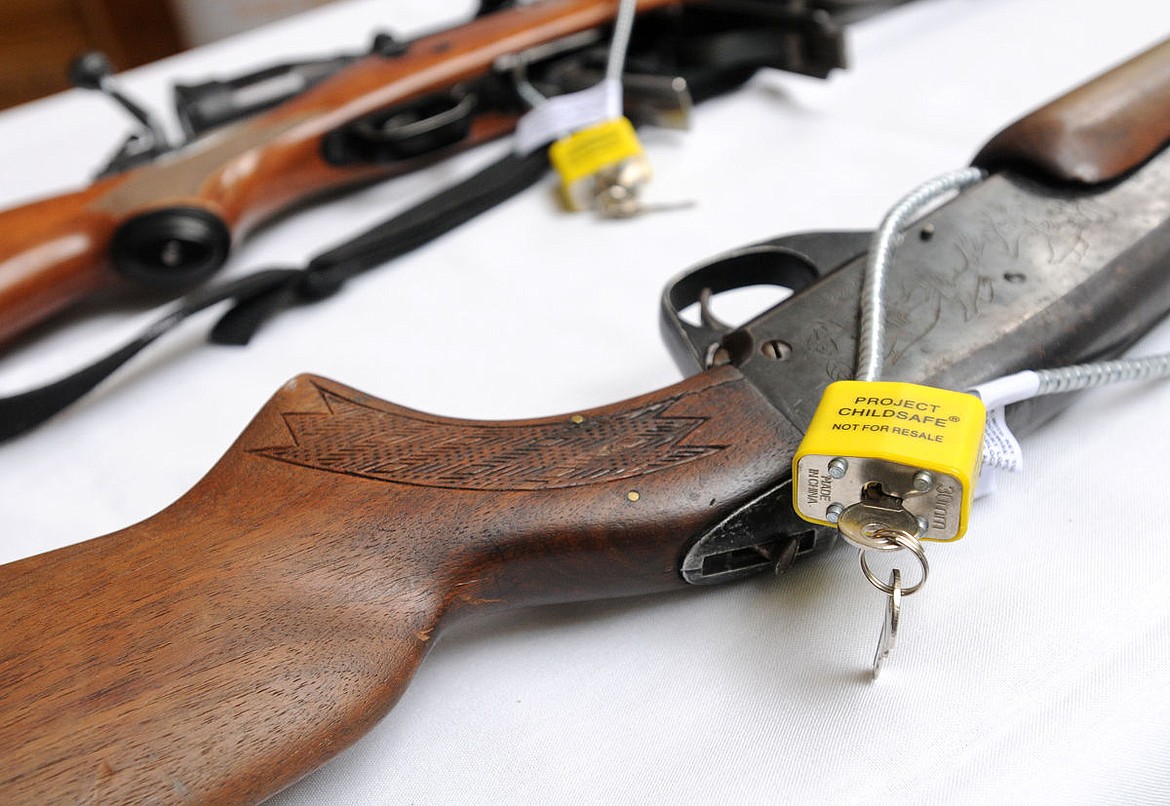 A cable lock is secured around a shotgun during the Project ChildSafe seminar at the Red Lion Inn on Wednesday. (Aaric Bryan/Daily Inter Lake)