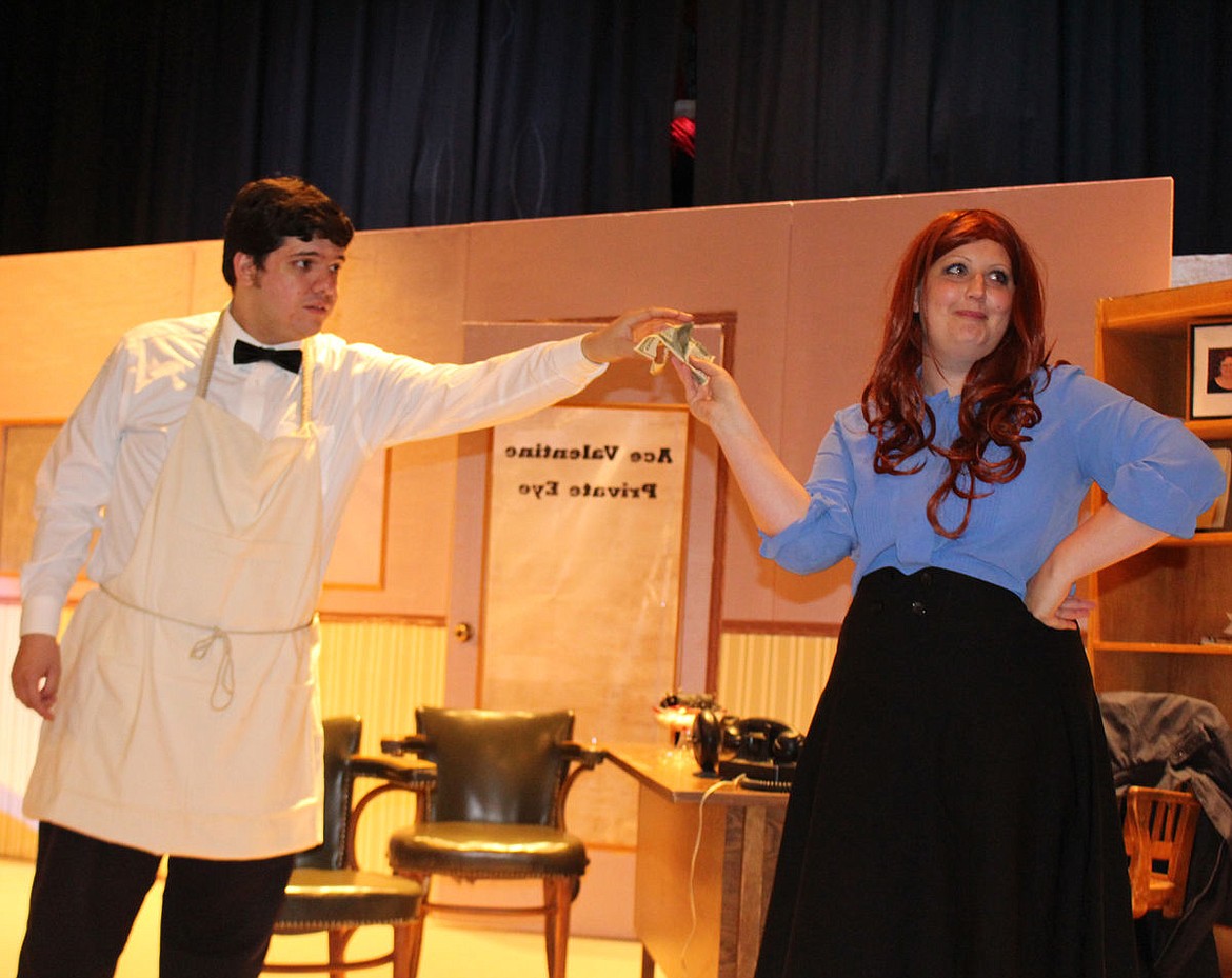 “Everybody in this play has kicked in,” she said. Peterson created the set decoration for the Shady Rabbit, and Nick Mahaney (who plays crooked Detective Jones) helped build the sets. Heather Rhoades is the assistant director. “Everyone just chipped in wholeheartedly,” Bracht said.